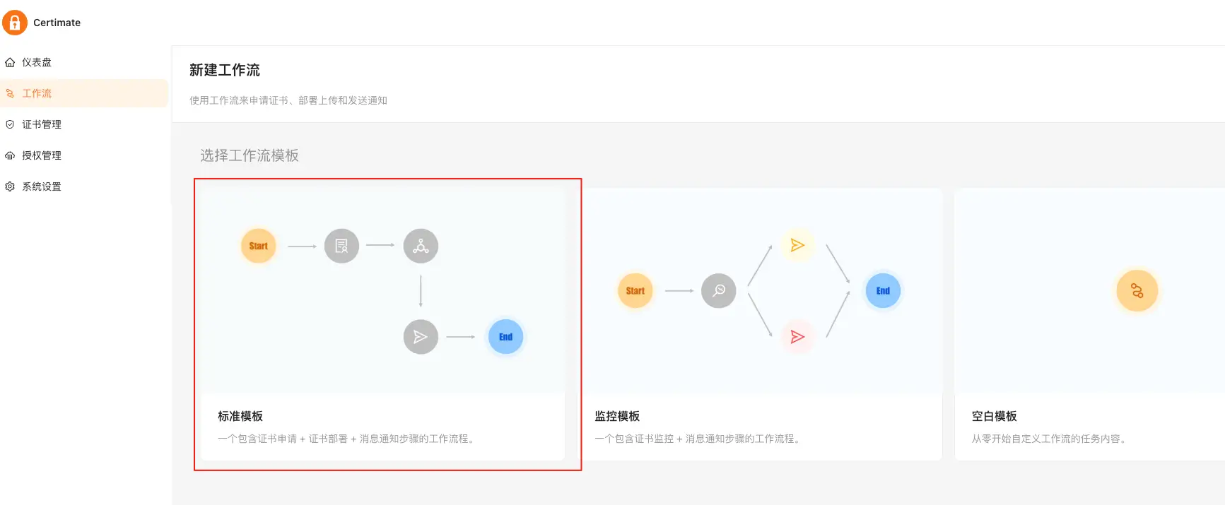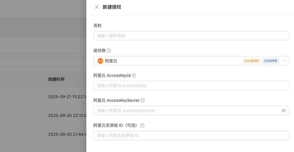 完了也别着急去新建工作流,而是先去「授权管理」新建授权。在 Certimate 上,我们一般只需要配置三个授权即可: