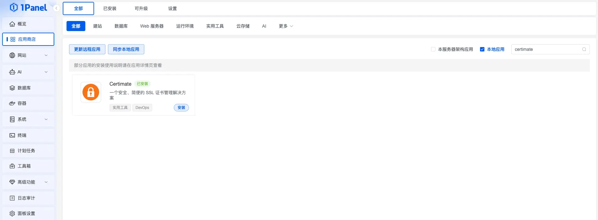 其中 Certimate 支持在 1Panel 的应用商店中一键安装,我就直接搜索安装了~
