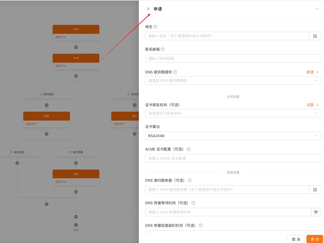 - 接下来是申请证书的节点,里面需要输入域名、邮箱和配置好的 DNS 提供商;