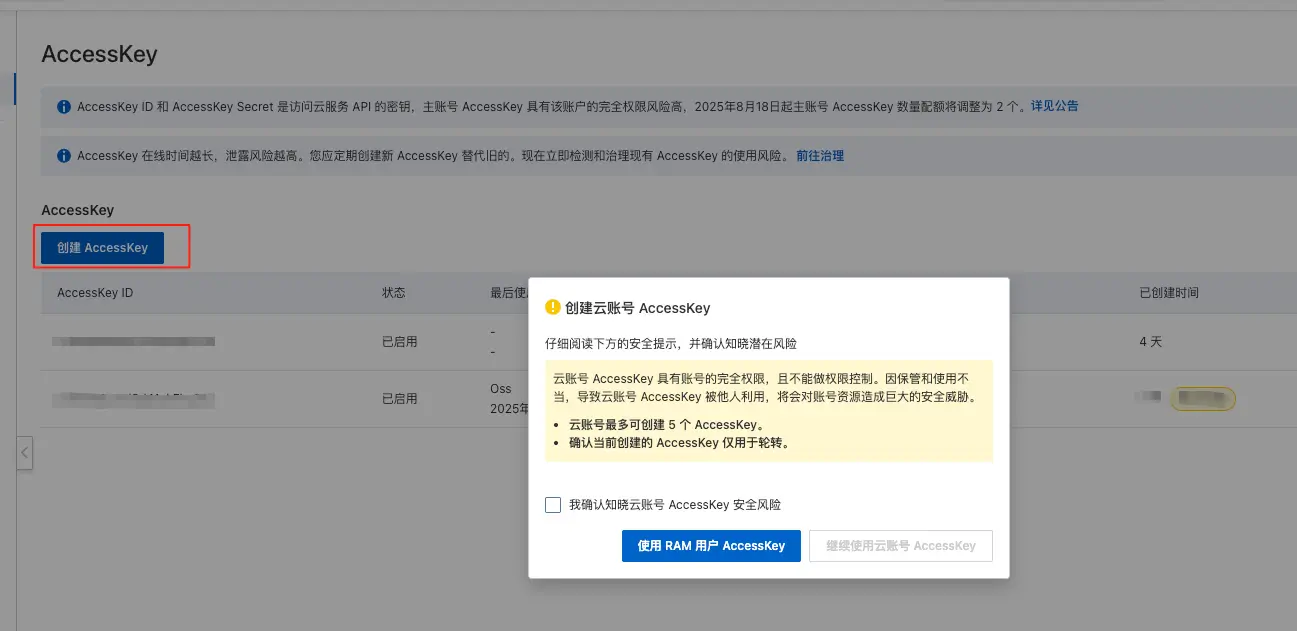 - 到 RAM 平台创建一个 RAM 账号,专门用来做这种第三方授权的 AK\SK,好处就是相对直接使用主账号来说比较安全;