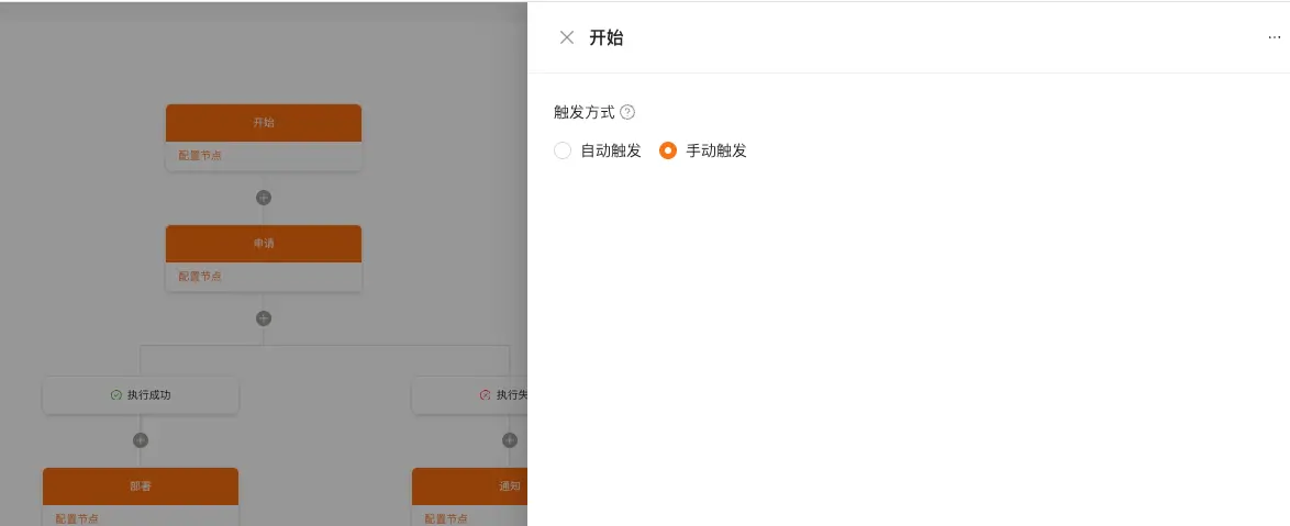 - 首先是开始节点,里面就两个选项:自动触发和手动触发。