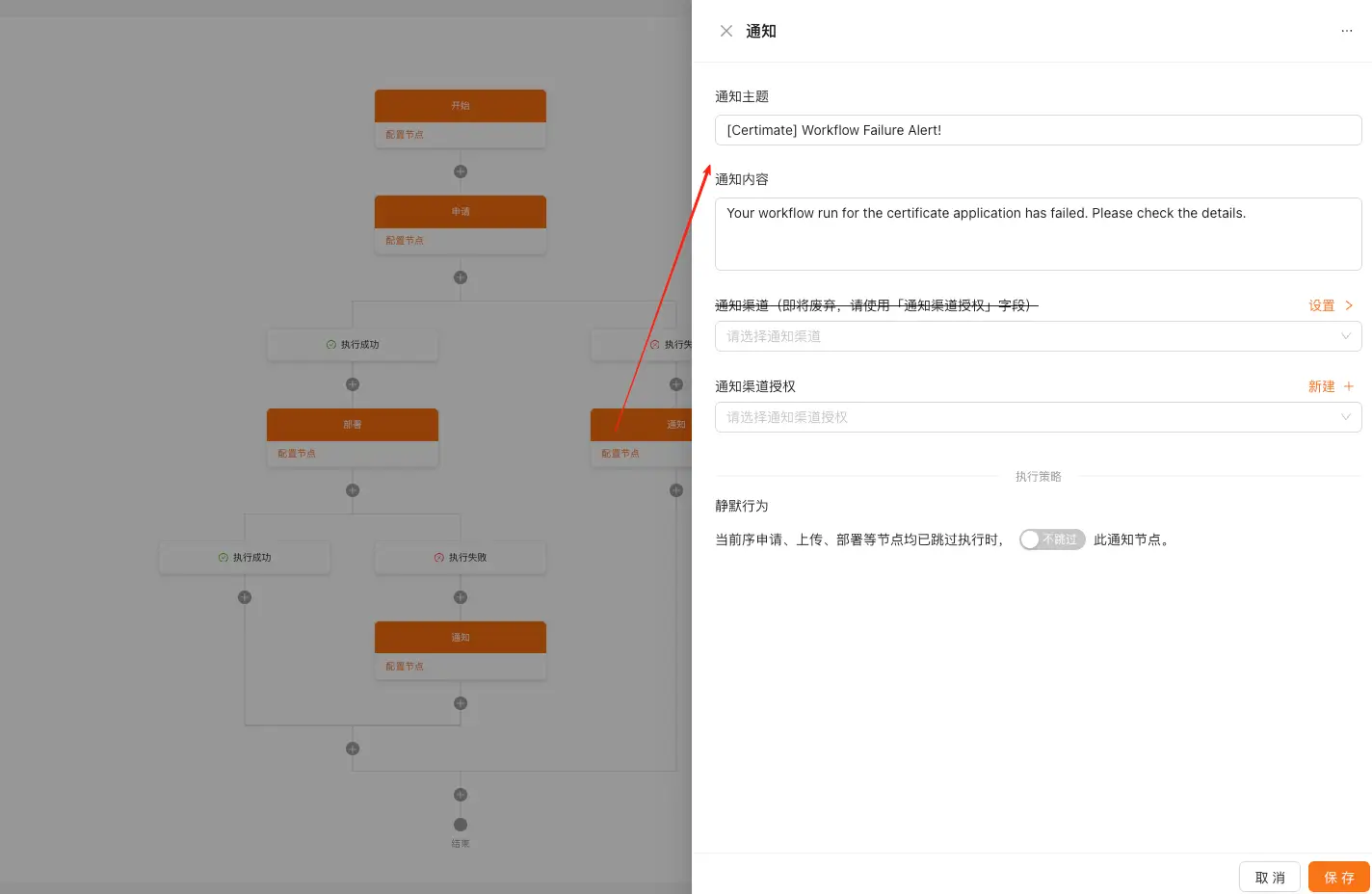 - 第三步的时候会根据成功或者失败走入不同分支。失败会走到通知节点,需要选择通知渠道;