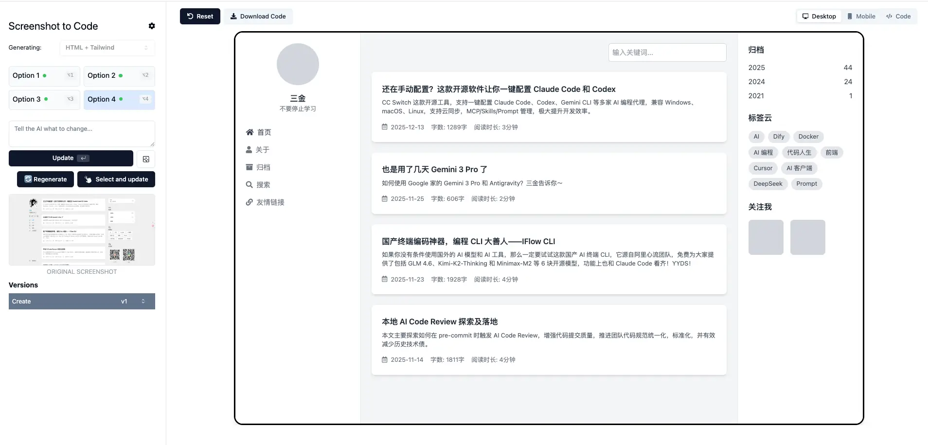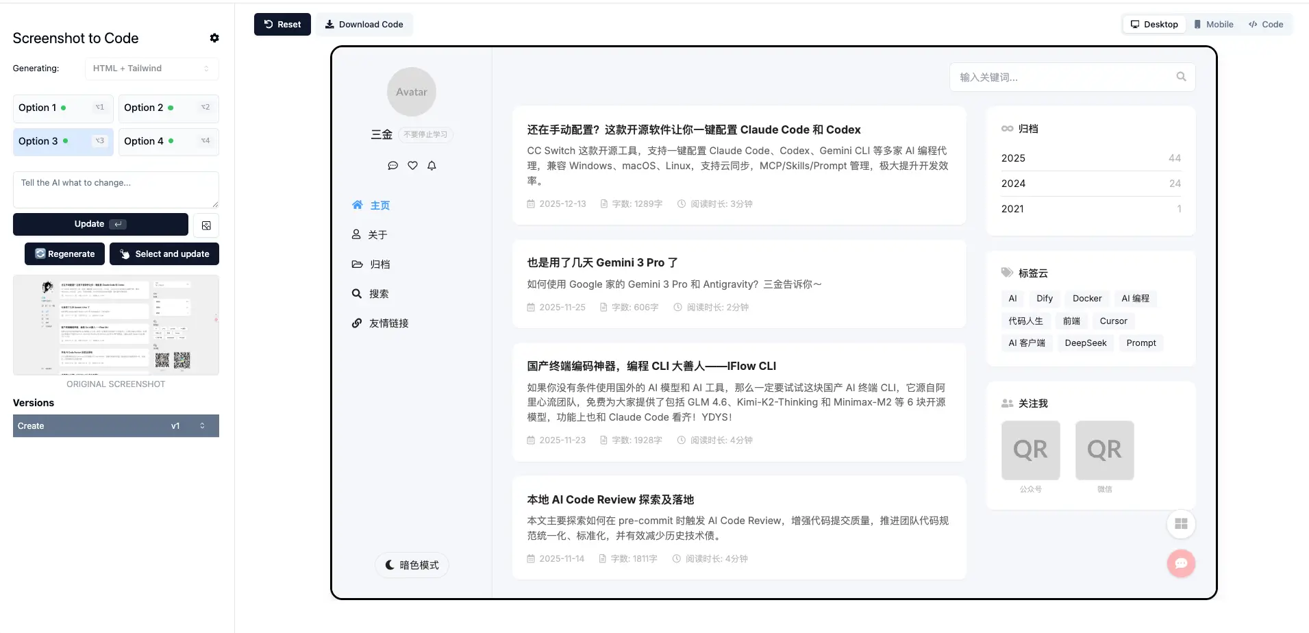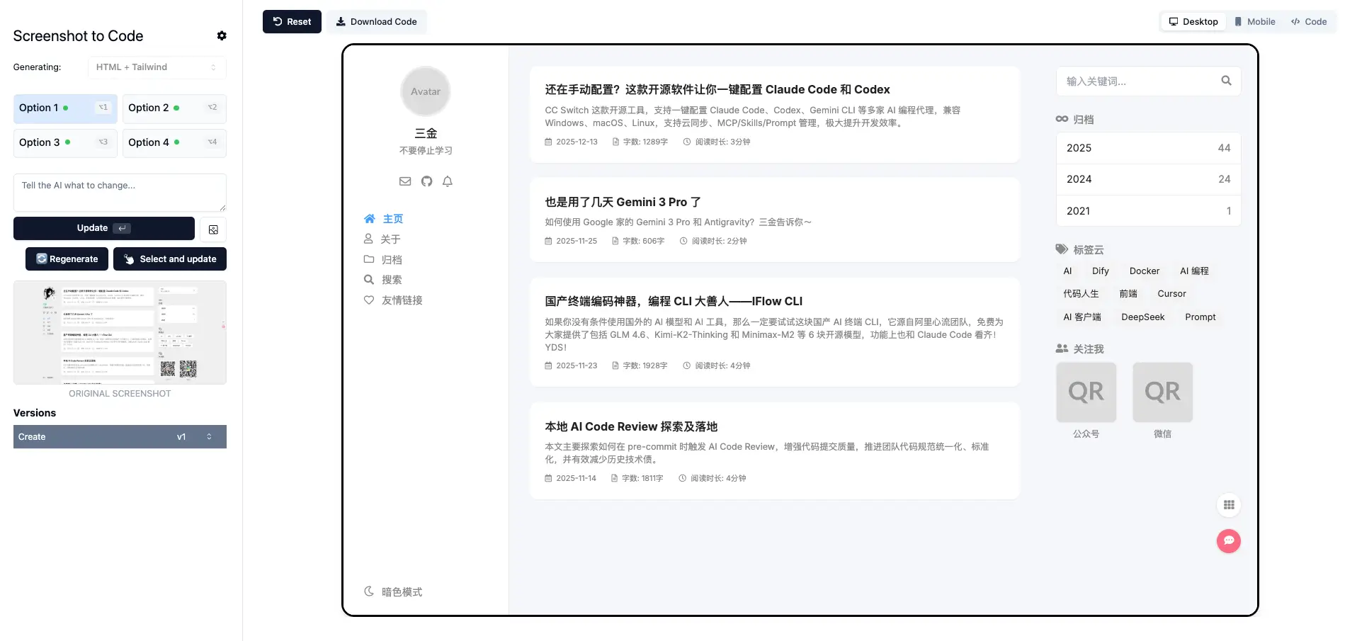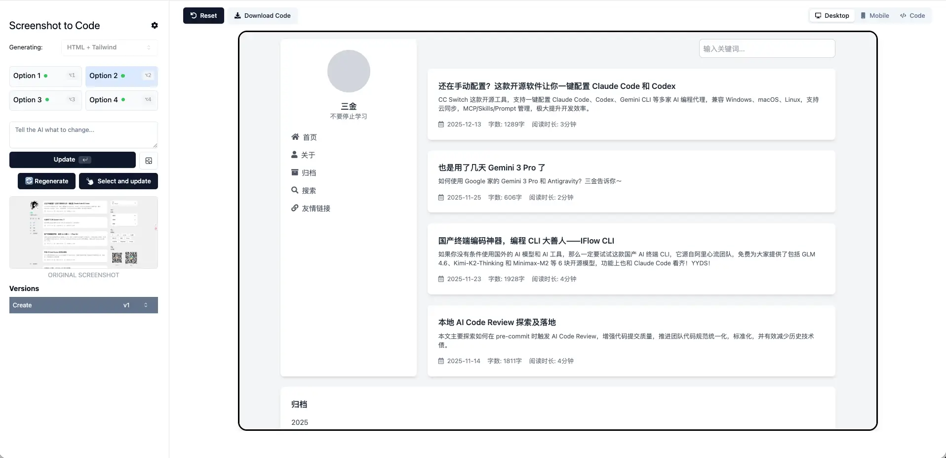 可以看到它确实生成了一个博客网页,但是差别还是有些大的。主题、布局、排版和原图都差距较大,像是在原图的基础上又按照自己的理解设计了一个新的出来,只适用于不太在乎还原度的玩家。