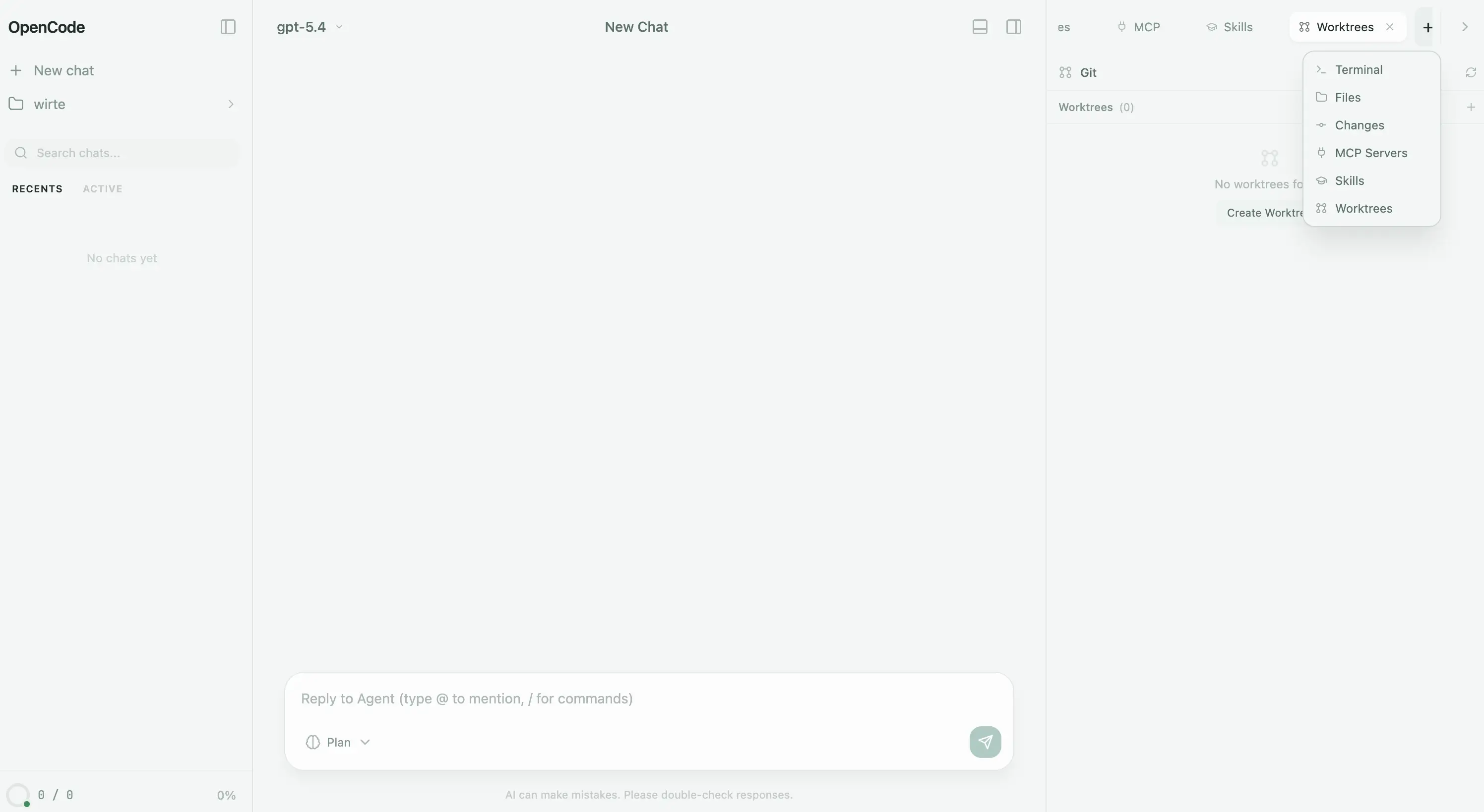 - 右边可以展示当前目录下的文件、修改的文件、Skills、MCP 以及 Worktrees。
